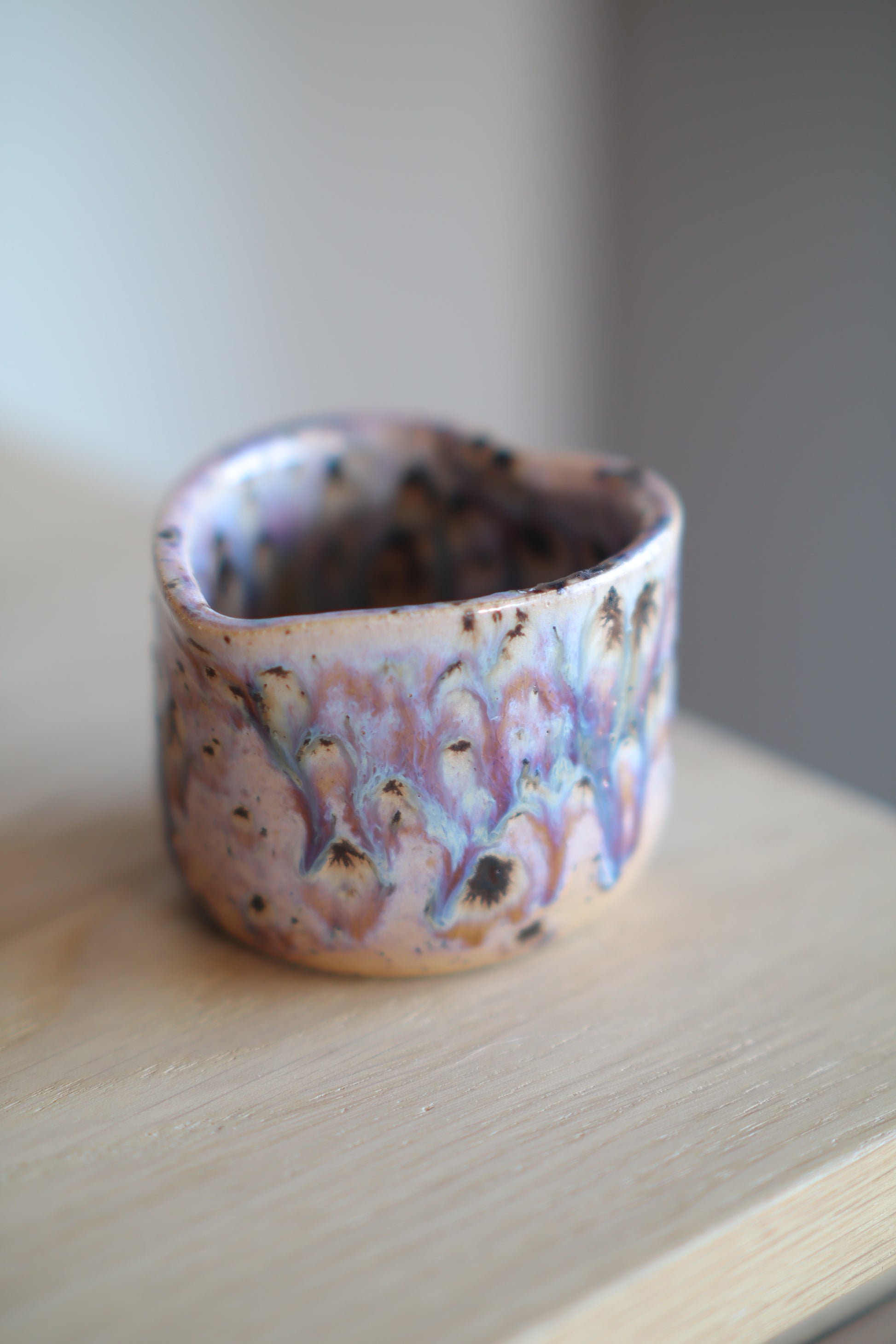 Handcrafted ceramic espresso cup featuring a distinctive heart silhouette with a mesmerizing pink-to-purple drippy glaze that evokes a sunset sky (also available in red!). Each piece is uniquely glazed, creating organic color variations that make your morning ritual feel special. Perfect for espresso enthusiasts who appreciate artisanal craftsmanship and want their daily brew served in something truly one-of-a-kind.